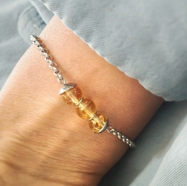 Pulsera 18 cm de largo 100% Acero quirúrgico hipoalergénico con 3 piedras roladas de piedra citrino 8 mm. Se presenta en pack para dedicar y regalar que incluye librito info de los beneficios del cristal, instrucciones para su limpieza y programación.